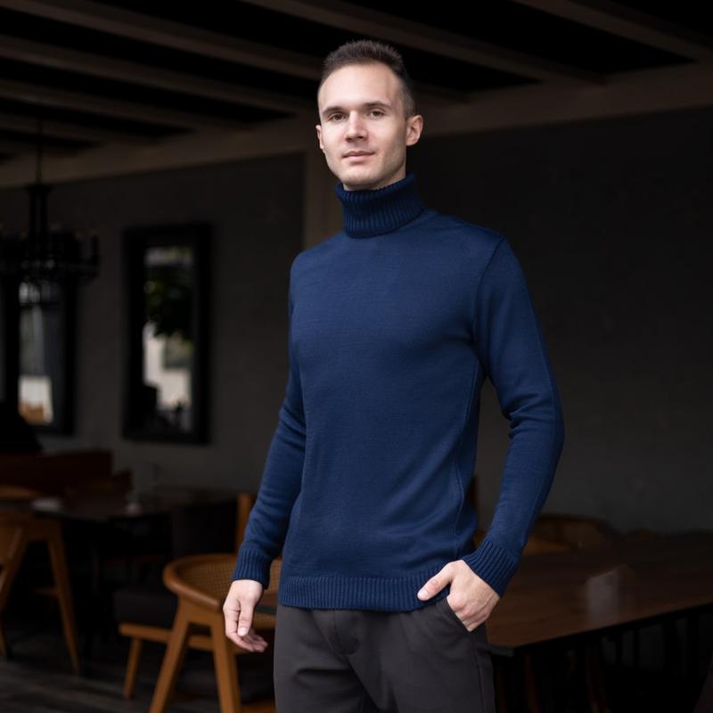 Светр під горло Pobedov "Axelrod" (Фсв00010) синій ▫️Відмінний чоловічий светр-гольф. ▫️ Матеріал: турецька пряжа 70% шерсть, 30% акрил ▫️Приталена модель. ▫️Має подвійну горловину, фасон - з відворотом, під горло. ▫️Дуже зручний, приємний до тіла. ▫️Зносостійкий і практичний - не кошлатиться при перших носіннях. ▫️Витриманий стиль, класичний крій і лаконічний дизайн светра не залишать ваш образ непоміченим, а приємний до тіла склад пряжі зігріє прохолодними вечорами.