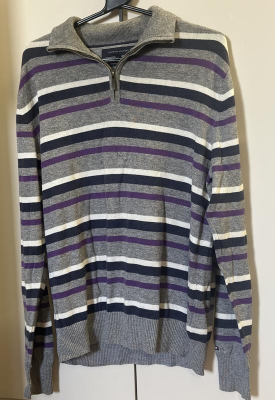 Бренд: Tommy Hilfiger. Тип виробу: Гольф/ светр з коміром-стійкою на блискавці. Колір: Сірий із смужками різних кольорів (фіолетовий, білий, темно-синій). Особливість: Комір на блискавці Розмір L Обхват грудей,100 см Обхват талії, 88 см Обхват 102,см