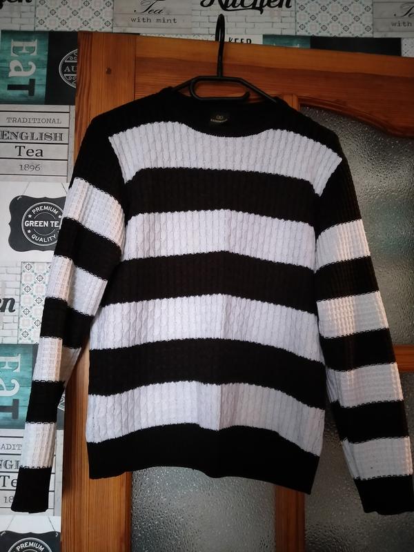 Стильная вязаная кофта в широкую черно-белую полоску. Длина от горловины 58 см, от плеча 60 см, длина рукава 61,5 см, ширина 51.5 см