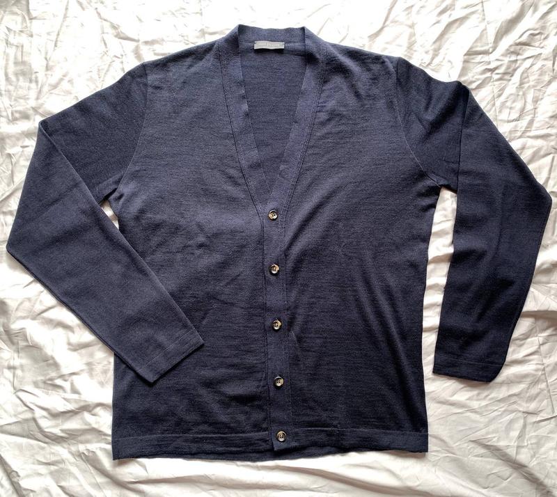 Роскошная легкая кофта на пяти пуговицах из шерсти и шелка, выполненная в Австрии. Очень мягкая, цвет - темно-синий роговые пуговицы 70 % шерсть merino extrafine 30 % шовк Запасная пуговица на месте Безложений, состояние новой без броков Размер ориентировочно XL / L, смотрите замеры: ПОГ 56 см рукав 65 длина 70 между плечевыми швами 43 Быстро отправлю
