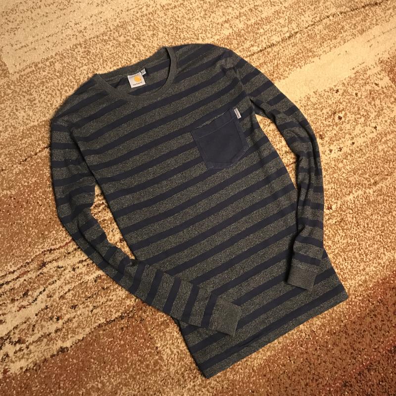 Кофта от Carhartt в серо синюю полоску На груди присутствует маленький карман Рукава на манжетах не растягиваются Цвет не утрачен Размер Л Стан 10/10