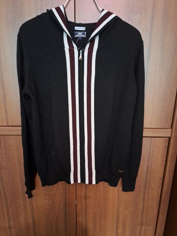 Кофта с капюшоном на молнии. Основной цвет черный, спереди и на капюшоне вертикальные полосы контрастных цветов- светло- серого ( меланж, фото 4) и бордового. Трикотаж мягкий, приятный на ощупь, молния качественная. Размер от производителя L. Пог.- 56, длина- 68, длина рукава- 70.