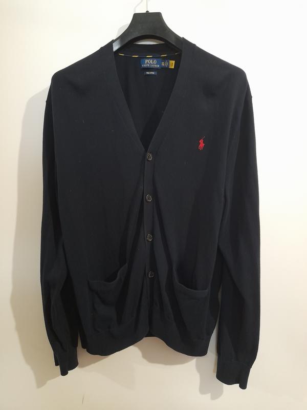 Оригинальная хлопковая кофта с карманами от Polo Ralph Lauren, темно-синего цвета, в идеале. 100% бавовна. Гудзики с логотипом бренда. Вышитый логотип красного цвета на груди с левой стороны. Размер: XXL Замеры: Полуобхват по спине: 65 см. в спокойном состоянии. Длина изделия: 73 см. Плечи: 58 см. около. Рукав: 68 см., линия плеча приспущена.