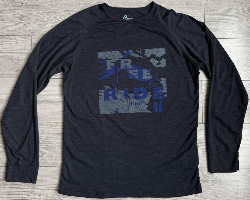 Классный шерстяной лонгслив от известного бренда, большой принт на груди, лого сзади под воротничком, легкий, очень мягкий и приятный на ощупь, тянется, быстро сохнет, хорошо выводит воду и отлично держит тепло Идеальное состояние Размер L замеры: грудь 53, длина 69, плечевой шов отсутствует, длина рукава от плеча 78, длина рукава по внутреннему шву 55