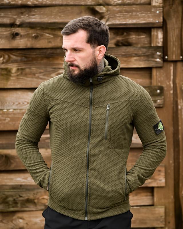 Флисовая термокофта Stone Island – стильная и теплая модель для активных мужчин, которым важны комфорт, практичность и сдержанный внешний вид. Кофта изготовлена из плотного флиса на трикотажной основе - материал мягкий, хорошо удерживает тепло, дышит и приятный к телу. Фактурная вязка в виде ста создает премиальный вид и подчеркивает атлетическую фигуру. Анатомический крой не стесняет движений, а капюшон с утяжками добавляет комфорта в прохладную погоду. Благодаря минималистичному дизайну и фирменной нашивке Stone Island модель отлично подходит для города, тренировок и активного отдыха. Особенности модели Материал: флис на трикотаже - теплый, мягкий, износостойкий Фактурная вязка «соты» - премиальный вид Анатомический крой, хорошо сидит по фигуре Капюшон с утяжками Нагрудный карман на молнии Два боковых кармана на молниях Фирменная нашивка Stone Island на рукаве Размеры: полномерные Параметры модели: рост 175 см, вес 75 кг — на фото размер S
