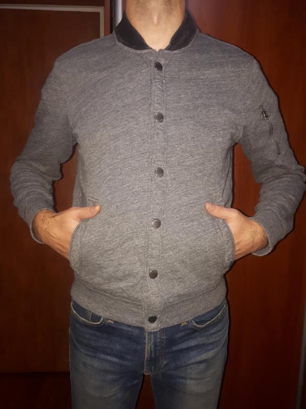 Легкая кофта с начесом от американского бренда Hollister. Садится по фигуре, при наличии таковой. Воротник стоичка выполнен из микровельвета. На рукаве кармашек на молнии, два кармана спереди, застегивается на кнопки. Состояние очень хорошее. Размер указан S, однако большемерит и подойдет на не плотный M-L. Замеры: плечи - 42, грудь - 52, рукав - 63,5, длина от ворота- 68.