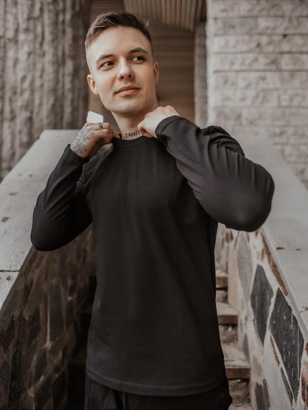 Лонгслив - футболка с длинным рукавом: - Цвет: черный; - Силуэт приталенный; горловой вырез круглый; легкая ткань, тактильно приятная, хорошо тянется; - Материал: хлопок с добавлением эластана. Сезон Весна/Осень. _____________ Замеры: S Длина по спине - 66 см; Полуобхват груди - 45 см; Длина рукава от плеча - 60 см M Длина по спине - 67 см; Полуобхват груди - 47 см; Длина рукава от плеча - 62 см L Длина по спине - 69 см; Полуобхват груди - 50 см; Длина рукава от плеча - 63 см XL Длина по спине - 70 см; Полуобхват груди - 53 см; длина рукава от плеча - 64 см XXL Дина по спине - 73 см; Полуобхват груди - 55 см; длина рукава от плеча - 65 см.