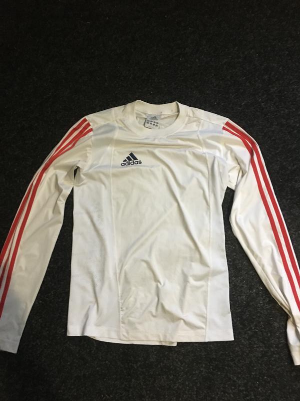 Лонгслив Adidas, белого цвета с красными полосками, сзади присутствует светоотражающий элемент. Лонгслив особенно практичен для спорта, он легкий, и тело дышит, очень удобно заниматься бегом или другими упражнениями