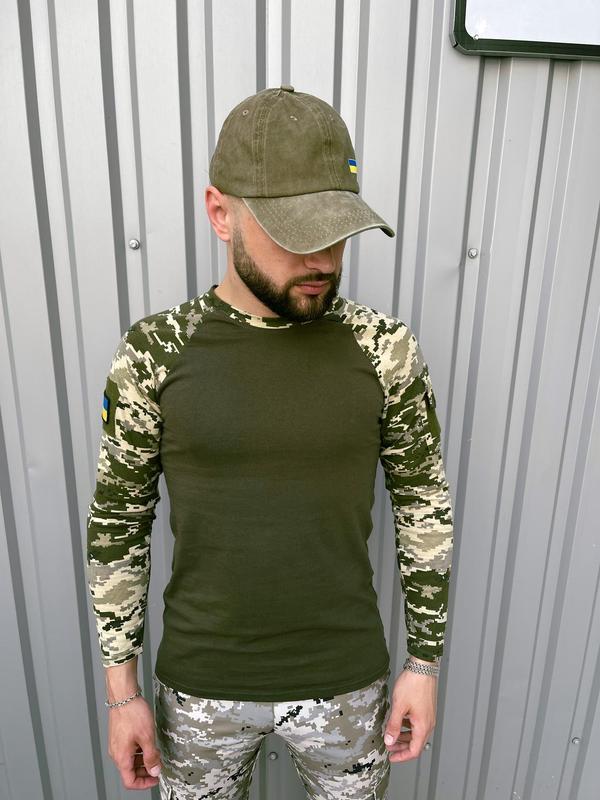 Лонгслів - футболка з довгим рукавом; - Матеріал: бавовна з додаванням еластану. Тканина легка, тактильно приємна, добре тягнеться; - Горловий виріз круглий. Силует приталений. - На рукавах є липучки під шеврон.