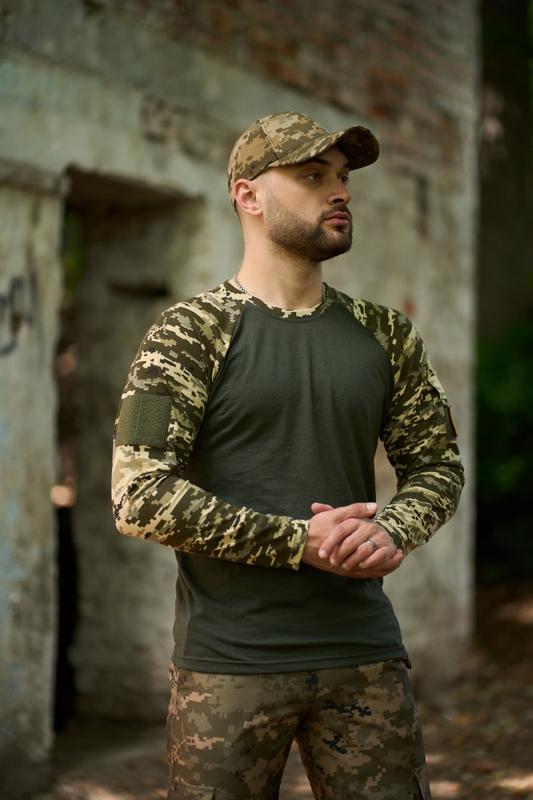 Лонгслив' Velcro' хаки с камуфляжом Лонгслив - футболка с длинным рукавом; - Материал: хлопок с добавлением эластана. Ткань легкая, тактильно приятная, хорошо тянется; - Горловый вырез круглый. Силует приталений. - На рукавах есть липучки.