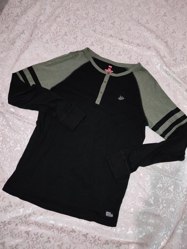 мужской лонгслив бренд ШЕ, черного цвета с бледно зелени вставки, размер на 158/164 приблизительно s-m, состояние идеальное, состав ткани 100 процентов коттон