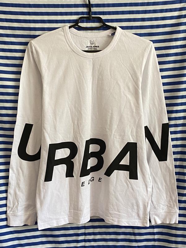 Білий лонгслів від бренда Jack&Jones. Дуже цікаво зроблений принт. Оригінал. Стан ідеальний. Розмір: SM.