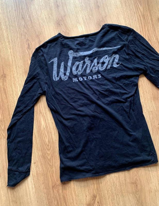 Легкий лонгслив из хлопка черного цвета Warson Motors fine vintage racing equipment. Из мира винтажных гаражей и мотогонок. С большим принтом на спине Состояние отлично Размерную берку срезано, размер M / S, смотрите замеры: ПОГ 50 см длина по спине 70 см Быстро отправлю
