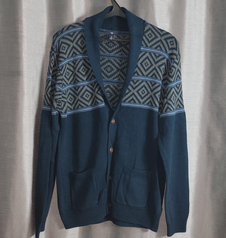 Мужская кофта GAP, размер L. Стильный и уютный кардиган на пуговицах в скандинавском стиле. Описание: Цвет: глубокий сине-зелёный с геометрическим узором по груди и плечам. Материал: плотный мягкий трикотаж (хлопок , приятный к телу). Застёжка на пуговицах. Два накладных кармана спереди. Свободный крой, комфортно садится на фигуру. Идеально подойдёт для прохладной погоды, офиса, прогулок или отдыха. Состояние: отличное, без дефектов. Размер: L (подойдёт на 50–52). Можно носить как самостоятельную вещь или поверх футболки/рубашки. Стиль — классика с намёком на ретро, очень уютный вариант на осень и зиму. Длина - 75 см. Плечи - 50 см. Рукав - 67 см. ПОГ - 54 см. ПОБ - 47/55 см.(внизу резинка) 2 кармана спереди. 100 коттон