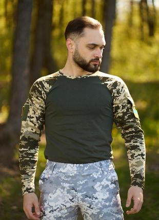 Матеріал: бавовна з додаванням еластану. Тканина легка, тактильно приємна, добре тягнеться; - Горловий виріз круглий. Силует приталений. - На рукавах є липучки під шеврон.
