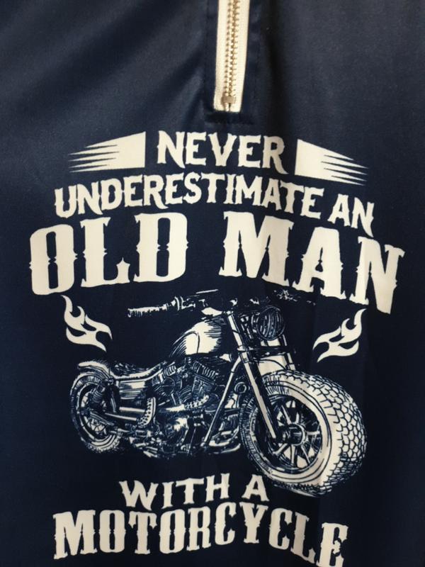 Яркий лонгслив на молнии NEVER UNDERESTIMATE AN OLD MAN WITH A MOTORCYCLE в идеальном состоянии. Материал 100% полиэстер, тонкий. Плечи 51 см., длина внешнего шва рукава 67 см., ширина груди под мышками 59,5 см., длина от шва воротника, посередине спины, 75 см.. Торг уместен. Смотрите другие мои объявления. Пишите - договоримся.