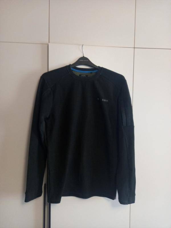 Плотный фактурный лонгслив, р.Л. Кармашек на левом рукаве,цвет тёмно зелёный.Плечи 45, длина по спинке 75, рукав 68см.