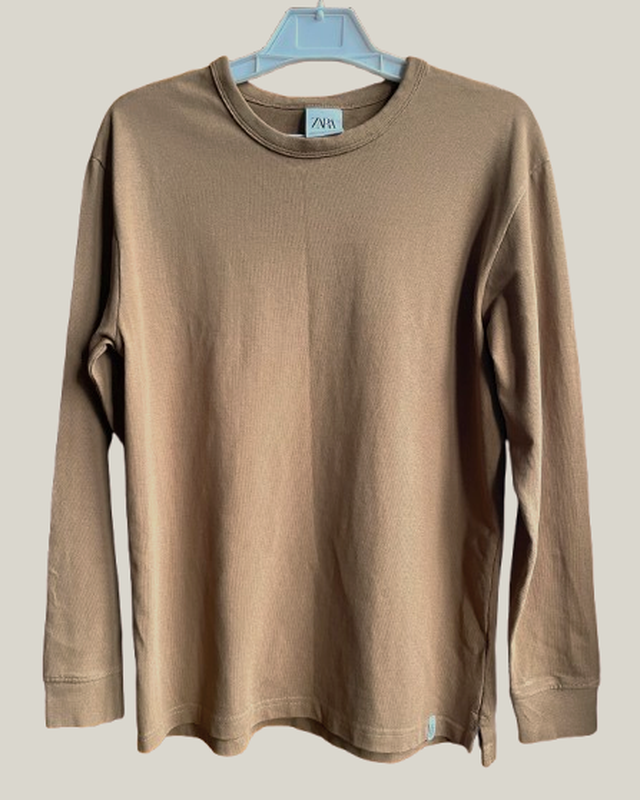 Коричневого цвета мужской лонгслив, выполненный из 100% хлопка. Длина по спине 68 см., ширина по плечам 49 - 50 см., длина рукава 50 см., ПОГ 47 - 49 см. Стан идеален.