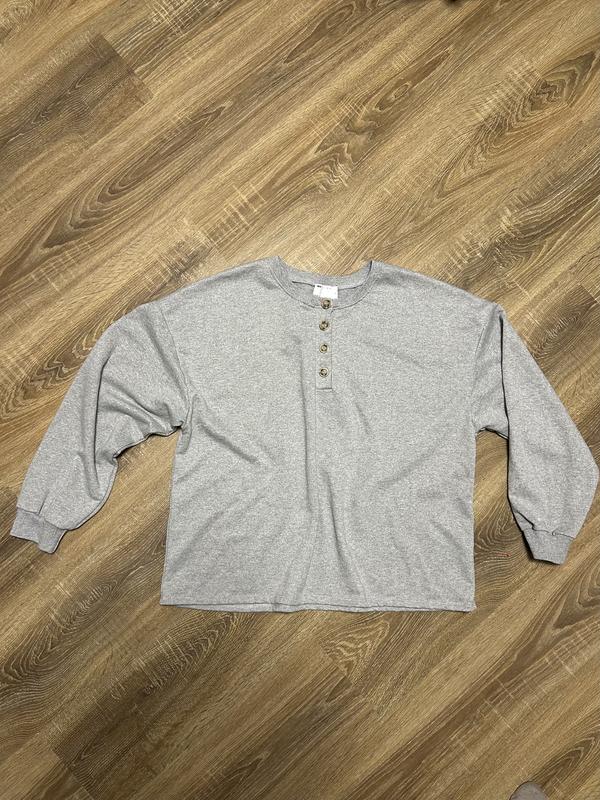 Сірий базовий лонгслів із м’якої бавовни (56% cotton), застібка на ґудзики. Вільний крій, спущена лінія плеча — чудово виглядає в повсякденних образах. 📏 Розмір: по бірці L • Груди — 62 см • Плечі — 65 см • Рукав — 51 см (спущений) • Довжина — 63 см