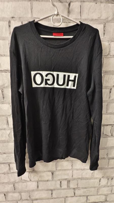 черная футболка с длинными рукавами (лонгслив) от бренда HUGO (часть Hugo Boss), которая имеет логотип, напечатанный задом наперед в белом прямоугольнике. Особенности дизайна Реверсивный логотип: Дизайн был вдохновлен тем, что логотип HUGO часто появлялся задом наперед в зеркальных селфи в социальных сетях, поэтому бренд выпустил капсульную коллекцию с намеренно инвертированным логотипом. Материал: Обычно такие изделия изготавливаются из мягкого хлопкового трикотажа, обеспечивающего комфорт и воздухопроницаемость. Крой: Представлен в различных вариантах кроя, включая стандартный (regular fit) и оверсайз