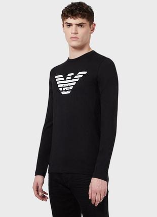 Черный лонгслив с большим логотипом Emporio Armani Большой логотип Круглый вырез Классическая посадка на талии На бирке ХЛ,маломерит на М Длина 67 Грудь 48,тянется Плечи 44 Рукав от горловины плеча 69 Ткань качество отличное, тянется