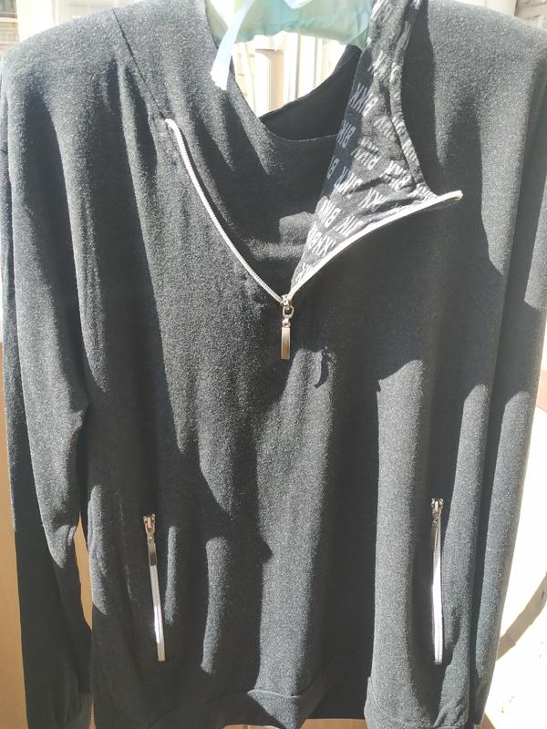 Лонгслив с капюшоном, карманами на молнии и короткой молнией на груди. Цвет тёмный графитовый, ткань мягкая, тянется хорошо. ПОГ51, длина-65, длина рукава-62см, плечи-45