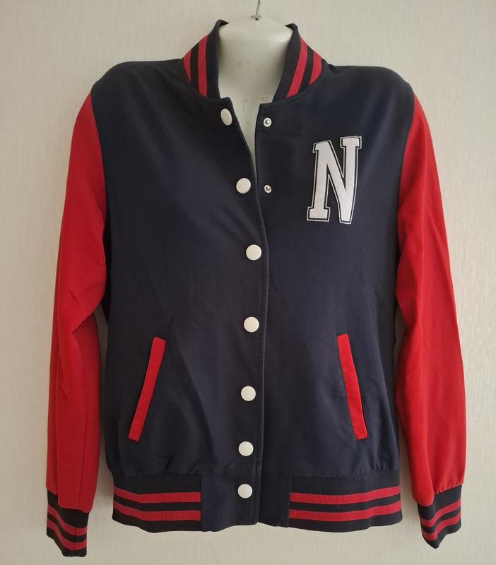 Кофта спортивного типу( американка).Ярка. Кармани,резинка на рукавах дуже плотна,Все в ідеалі ,на кнопках Розмір:10/12(44/46) Плечи-41 Пог-51 Пот-48 Довжина-60 Рукав-63 35%котон 35%віскоза 30%поліестер