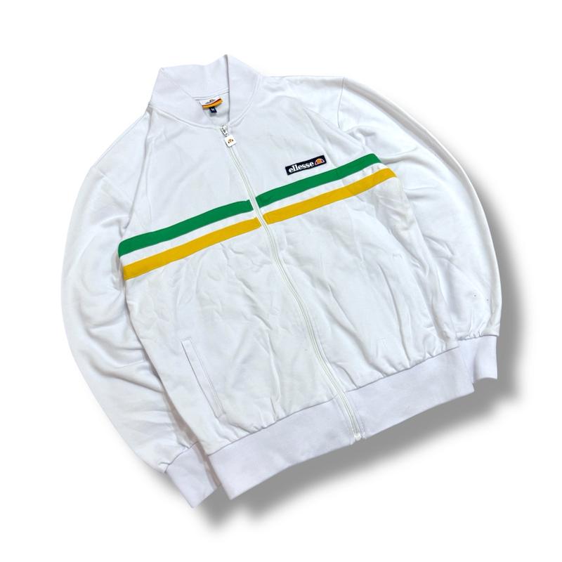 Олімпійка ellesse білого кольору зі смужками та нашивкою ЦІНА: 680 РОЗМІР: М Довжина - 66 см Довжина рукава від коміру - 75 см Напівобхват - 55-56 см СТАН: Чудовий