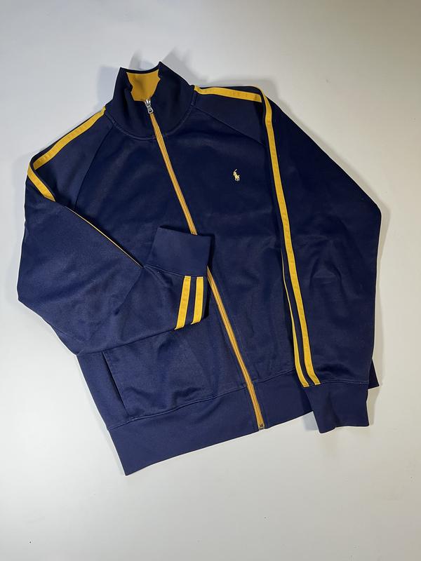 Polo Ralph Lauren. Класична спортивна кофта на блискавці у вінтажному стилі. Темно-синій колір із жовтими контрастними лампасами на рукавах і плечах, фірмовий логотип Polo на грудях. Високий комір, зручні кишені, м’який і щільний матеріал — добре тримає форму, підходить для повсякденного носіння. Стан речі: хороший (є дефект — не критичний, на носіння не впливає) Розмір речі: M Спосіб оплати: безпечна оплата, накладений платіж з передоплатою 150 грн, оплата на карту (-10%)