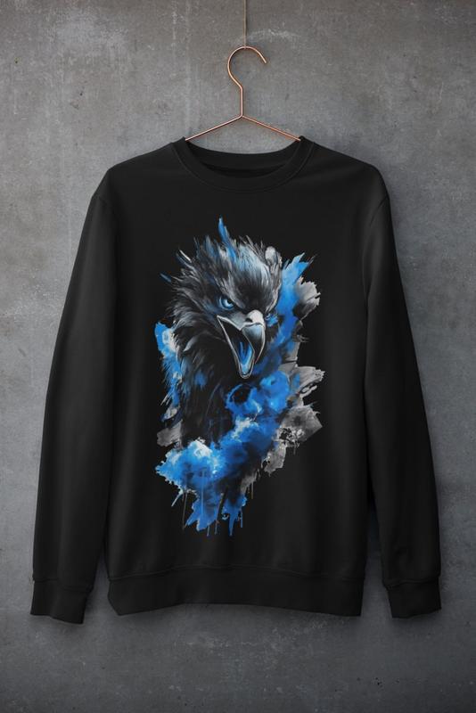 вітшот "Орел — Символ Сили" створений для тих, хто цінує свободу, силу та стиль. На грудях розташовано яскравий принт із зображенням грізного орла з пронизливим поглядом, виконаний у синьо-чорних відтінках. Динамічний дизайн із ефектом акварельних мазків надає виробу сучасного вигляду. Цей світшот — ідеальний вибір для повсякденного носіння або створення ефектного образу. Він забезпечує комфорт і привертає увагу своїм яскравим дизайном. Деталі: Матеріал: 80% бавовна, 20% поліестер, м'який та теплий. Крой: унісекс, класичний фасон. Принт: високоякісний, стійкий до прання. Колір: насичений чорний, що підкреслює деталізацію зображення. Розміри: доступні S, M, L, XL, XXL.