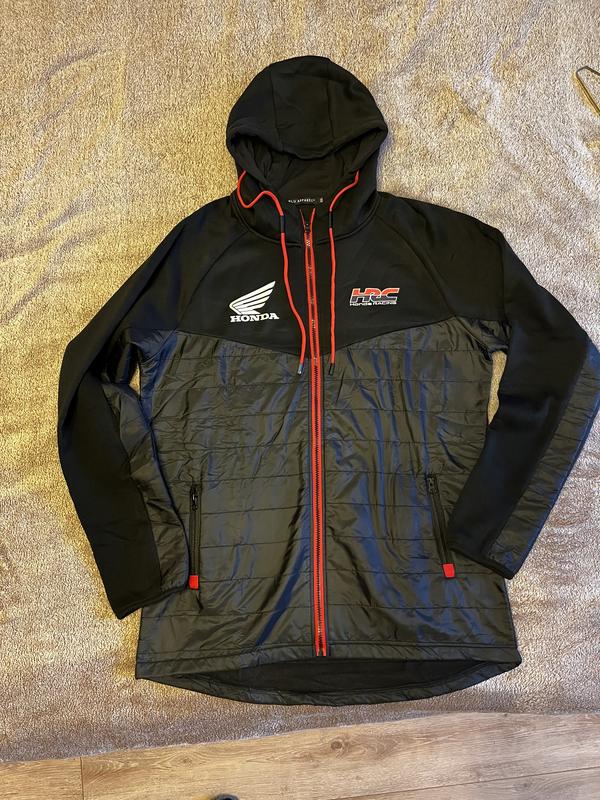 кофта з капюшоном на блискавці з логотипом Honda Racing. Тонка і легка але тепла. Матеріал мікрофліс та поліестер. Нова. Розмір наш 52-54 на чоловіка зростом 180-185см.