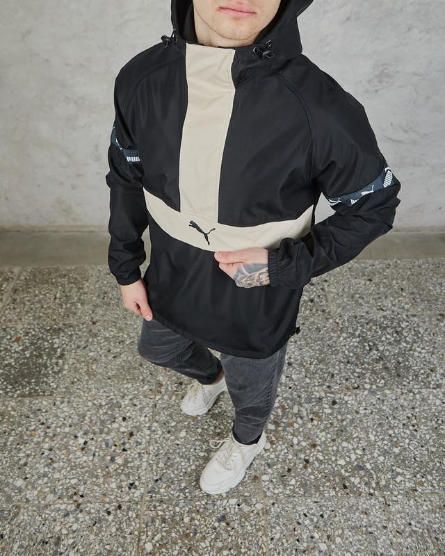 Размеры: S, M, L, XL - Цвет: черный с бежевой вставкой - Материал: плащевка на трикотажной основе - Брендовый лампас на рукавах - Емкий карман под планкой - Капюшон и низ анорака регулируется затяжками