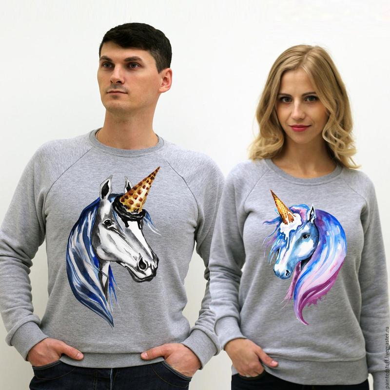Парные свитшоты с принтом Единороги (мороженое) Push IT Стильные брендовые свитшоты с крутым принтом. Свитшоты из хлопка для приятной повседневной носки. Печать наносится цифровым способом, поэтому принт выдержит большое количество стирок и хорошо пропускает воздух к телу. Хлопковые свитшоты с принтами удобно носить как летом так и зимой.