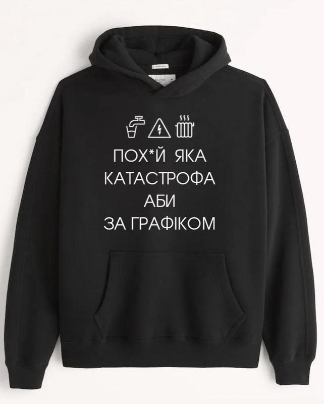 Худі - "ПОХ*Й ЯКА КАТАСТРОФА АБИ ЗА ГРАФІКОМ" Можливе нанесення Ваших абревіатур, ініціалів, персональних дат або будь-якого іншого тексту. Втілимо в реальність вашу ідею. В наявності більше 15 різних кольорів одягу та кольорів для нанесення принта. Матеріал: 65% бавовна, 35% поліестер, преміум якості. В наявності Всі Розміри від XS до 2XL (таблиця розмірів вказана нище) Для уточнення всіх деталей (розмірів, кольорів і т.д.) просимо писати нам у ******** | ***** | ******** +38************** Юрій