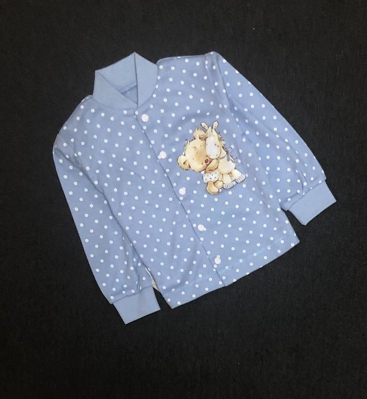 Кофта виготовлена із натуральної тканини - інтерлок (100% бавовна). На рукавах та горловині трикотажна манжета. По всій довжині на кнопках. Заміри: довжина/рукав/у грудях 68 см: 29/25/50 см