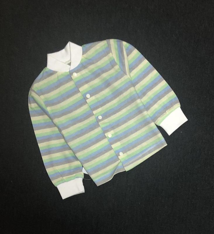 Кофта виготовлена із натуральної тканини - інтерлок (100% бавовна). На рукавах та горловині трикотажна манжета. По всій довжині на кнопках. Заміри: довжина/рукав/у грудях 68 см: 29/25/50 см