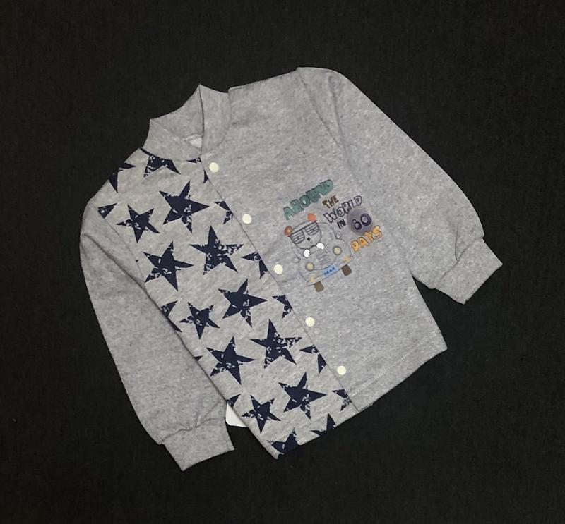 Кофта для дитини, виготовлена із утепленої тканини - футер (бавовна з начосом). По всій довжині застібається на кнопках. Манжети та горловина - еластична трикотажна резинка. Заміри: довжина/рукав/у грудях 74 см: 31/27/55 см80 см: 35,5/30/58 см