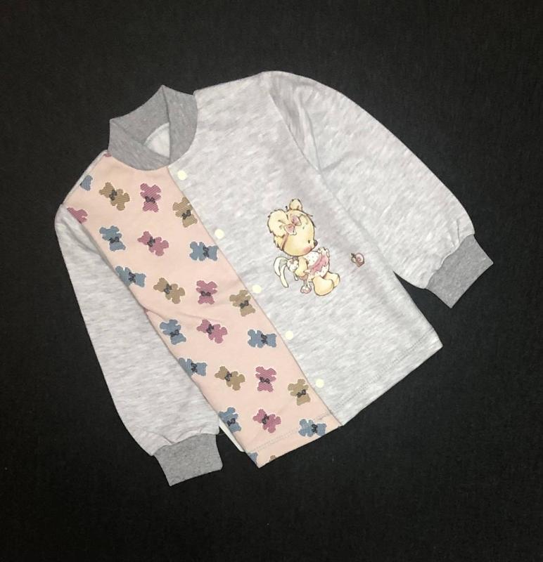 Кофта для дитини, виготовлена із утепленої тканини - футер (бавовна з начосом). По всій довжині застібається на кнопках. Манжети та горловина - еластична трикотажна резинка. Заміри: довжина/рукав/у грудях 74 см: 31/27/55 см80 см: 35,5/30/58 см