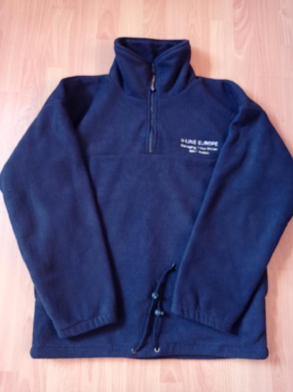 тепла флісова кофта темно синього кольору з поліестеровою підкладкою. Висока горловина, внизу має стягуючий шнурок, Розмір С, але краще орієнтуватися по замірах на фото.