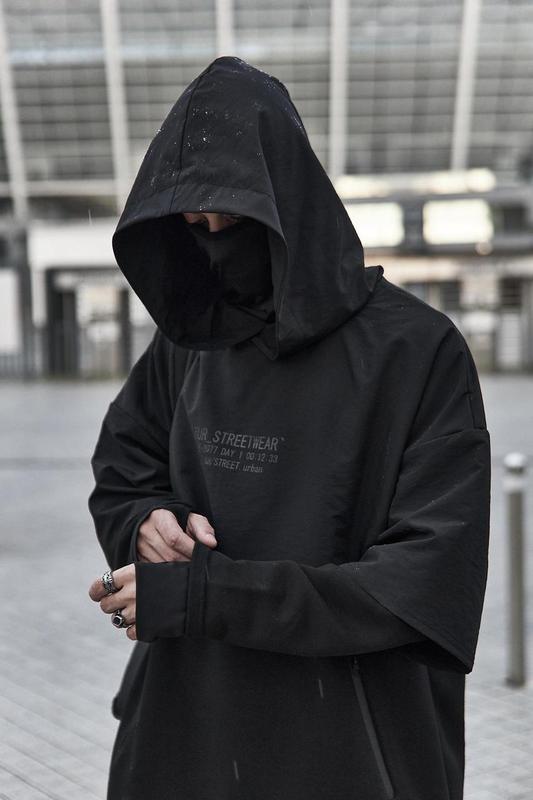 Худі пончо Ганрю Розміри: S,M,L Основна тканина: тренитка ( петля), 95% коттон, 5% поліестер. Додаткові вставки: Плащівка, рукава Мікродавінг Принт: шовко трафаретний друк Особливості: худі-пончо вільного крою, с карманом попереду; в шиї виробу є баф, який легко ховається, застібка на капюшоні у вигляді магниту, рукави з мікродайвінгу з отвором для пальця, об'ємний друк