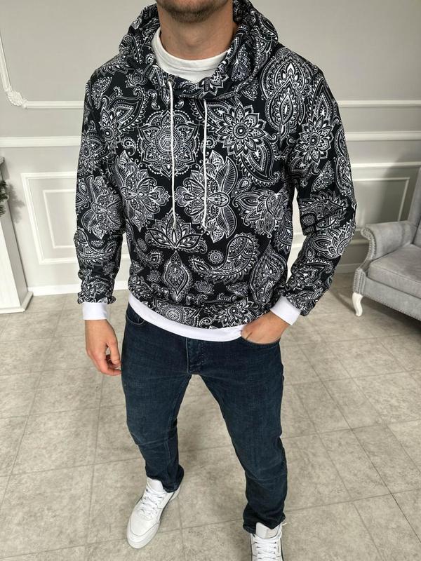 Модный демисезонный черный худи для мужчин с принтом мандала на манжетах Стильные худи с капюшоном - Ваш образ для всех сезонов! Худи изготовлены из качественных материалов, обеспечивающих комфорт и долговечность. Благодаря капюшону Вы сможете защитить себя от ветра и дождя, а мягкая ткань обнимет вас уютом. Они легко сочетаются с джинсами, спортивными штанами или шортами, позволяя вам создавать неповторимые образы для любой ситуации. Пусть худи с капюшоном станут Вашим защитником от погодных условий и модным акцентом в вашем гардеробе! Материал: котон/двунитка Крой: свободный Капюшон: оснащен затяжным шнурком Дополнительно: низ и рукава на манжетах Рекомендации по уходу: Использовать только жидкое средство для стирки Стирать при температуре воды - 30-40 Не следует использовать кондиционеры или отбеливатели Не использовать функцию сушки Отжим только на низких оборотах Почему Вы должны выбрать именно нас? Работаем без предоплат Наложенный платеж Пром оплата Оплата на карту Быстрая доставка Доставка 1-2 дня Если заказ до 12:00 отправка в день заказа Качество товара Перед отправкой мы проверяем товар на наличие брака Качественный сублимационный принт Таблиця замірів: РозмірГрудиРукавДовжина кофти S50 см.60 см.63 см. M52 см.60 см.65 см. L57 см.65 см.65 см. XL59 см.68 см.66 см.