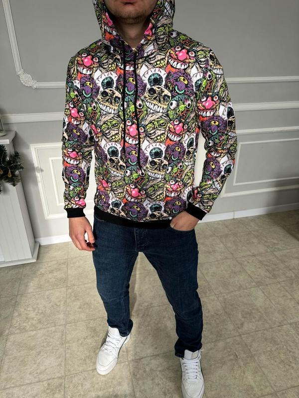 Яркий принтованый худи с капюшоном Худи один из самых популярных видов толстовок в наше время. Они стали универсальной модной одеждой для всех случаев жизни: как для выхода на прогулку, так и для деловой встречи. Худи одинаково популярны как в мужском, так и в женском гардеробе и являются элементом одежды унисекс. Худи удобные, уютные, спортивные и невероятно стильные. С ними можно сделать огромное количество модных и не повторимых образов. Толстовка приятная к телу и подойдет абсолютно каждому кто захочет выглядеть интересно. Также она не кашлатится и не линяет при стирке, что не доставит Вам неудобств при носке. - Ткань: 100% коттон. Двунитка - Свободный крой - Низ рукава на манжетах - При стирке не кашлатится и не линяет С нашей размерной сеткой Вам будет легче подобрать размер Для более точного подбора размера укажите рост и вес Рекомендации по уходу: - Использовать только жидкое средство для стирки - Стирать при температуре воды - 30-40 - Не следует использовать кондиционеры или отбеливатели - Не использовать функцию сушки - Отжим только на низких оборотах. Преимущества работы с нашей компанией: - Обмен и возврат товара без проблем - Никаких предоплат если в заказе не больше двух позиций - Отправка наложенным платежом либо по полной оплате, как вам удобно! Выглядеть на все 100% может каждый. В наше время можно с помощью вещей самовыражаться, быть ярким и стильным в одно время. Но многие считают, что можно не следовать моде и трендам и выглядеть при этом потрясающе, но это не верно! Формирование неповторимого образа требует тщательного анализа современных тенденций в моде и самое важное - наличие производителей, которые ориентируются на эти требования. Таблиця замірів: РозмірГрудиРукавДовжина кофти S52 см.72 см.66 см. M55 см.75 см.70 см. L58 см.78 см.72 см. XL61 см.80 см.74 см.