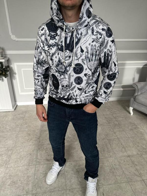Стильный белый мужской демисезонный худи с черным абстрактным принтом Стильные худи с капюшоном - Ваш образ для всех сезонов! Худи изготовлены из качественных материалов, обеспечивающих комфорт и долговечность. Благодаря капюшону Вы сможете защитить себя от ветра и дождя, а мягкая ткань обнимет вас уютом. Они легко сочетаются с джинсами, спортивными штанами или шортами, позволяя вам создавать неповторимые образы для любой ситуации. Пусть худи с капюшоном станут Вашим защитником от погодных условий и модным акцентом в вашем гардеробе! Материал: котон/двунитка Крой: свободный Капюшон: оснащен затяжным шнурком Дополнительно: низ и рукава на манжетах Рекомендации по уходу: Использовать только жидкое средство для стирки Стирать при температуре воды - 30-40 Не следует использовать кондиционеры или отбеливатели Не использовать функцию сушки Отжим только на низких оборотах Почему Вы должны выбрать именно нас? Работаем без предоплат Наложенный платеж Пром оплата Оплата на карту Быстрая доставка Доставка 1-2 дня Если заказ до 12:00 отправка в день заказа Качество товара Перед отправкой мы проверяем товар на наличие брака Качественный сублимационный принт Таблиця замірів: РозмірГрудиРукавДовжина кофти S50 см.60 см.63 см. M52 см.60 см.65 см. L57 см.65 см.65 см. XL59 см.68 см.66 см.