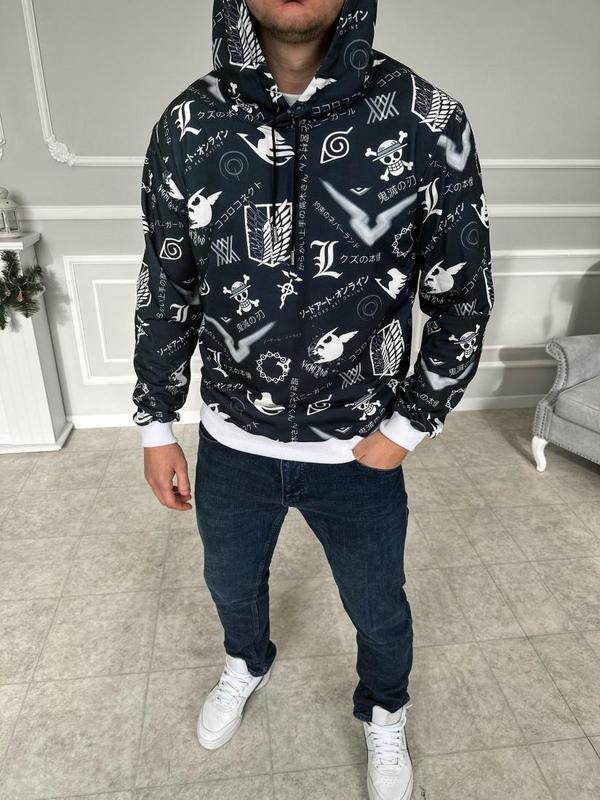 Чоловічий худі з принтом - це модний та стильний верхній одяг, який поєднує комфорт спортивного стилю з індивідуальним виразом завдяки виразному дизайну на передній частині. Чоловічі худі з принтом підходять для повсякденного носіння, вільного часу, активних вихідних, походів на природу або просто для створення незвичайного образу. Ви можете поєднувати худі з принтом з джинсами, спортивними штанами або іншими варіантами низу, а також доповнювати стиль аксесуарами, такими як кепка, окуляри або шапка. Цей одяг - це не лише зручний варіант для вільного часу, але і спосіб виразити свій стиль та особистість завдяки вибору унікального принту. Таблиця замірів: РозмірГрудиРукавДовжина кофти S51 см.73 см.62 см. M56 см.76 см.63 см. L59 см.81 см.66 см. XL62 см.83 см.68 см.