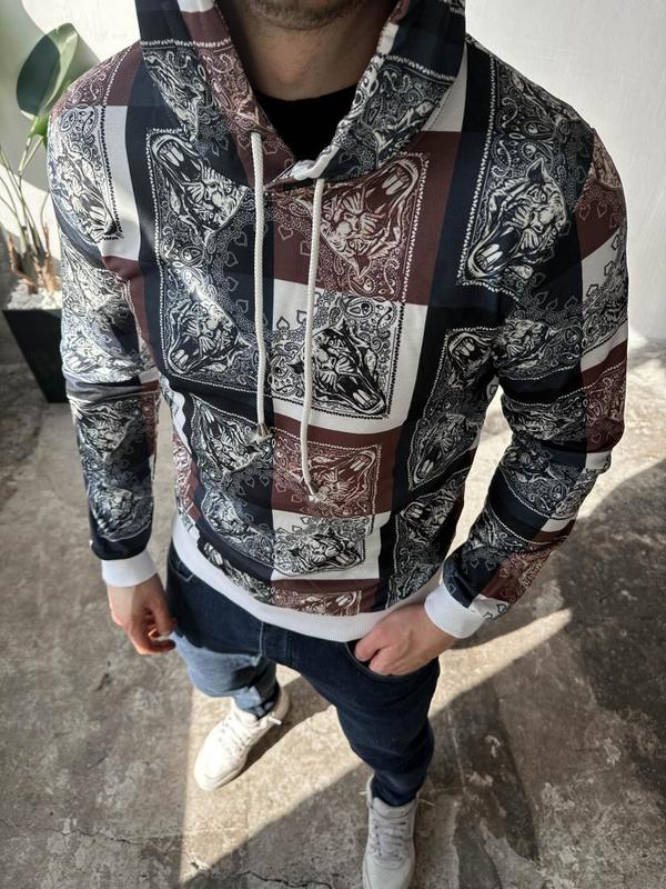 Чоловічий худі з принтом - це модний та стильний верхній одяг, який поєднує комфорт спортивного стилю з індивідуальним виразом завдяки виразному дизайну на передній частині. Чоловічі худі з принтом підходять для повсякденного носіння, вільного часу, активних вихідних, походів на природу або просто для створення незвичайного образу. Ви можете поєднувати худі з принтом з джинсами, спортивними штанами або іншими варіантами низу, а також доповнювати стиль аксесуарами, такими як кепка, окуляри або шапка. Цей одяг - це не лише зручний варіант для вільного часу, але і спосіб виразити свій стиль та особистість завдяки вибору унікального принту. Таблиця замірів: РозмірГрудиРукавДовжина кофти S50 см.60 см.63 см. M52 см.60 см.65 см. L57 см.65 см.65 см. XL59 см.68 см.68 см.