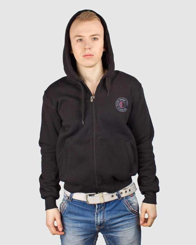Черная толстовка мужская с капюшоном Ventuno. Она выполнена в классическом стиле, имеет простой и практичный дизайн. Толстовка застегивается на молнию спереди, что делает ее удобной для ношения и быстрой одежды. Капюшон оснащен затягивающими шнурками, что позволяет регулировать его объем. На груди, с левой стороны, расположен небольшой логотип или эмблема круглой формы, придающая изделию индивидуальность и брендирование. По бокам есть два накладных кармана для рук, что также добавляет практичности. Рукава и нижняя часть толстовки имеют манжеты из эластичного материала, что обеспечивает лучшую посадку по фигуре и защиту от ветра. В общем, эта толстовка является удобным и универсальным элементом одежды, который подходит для повседневной носки и спортивного стиля.