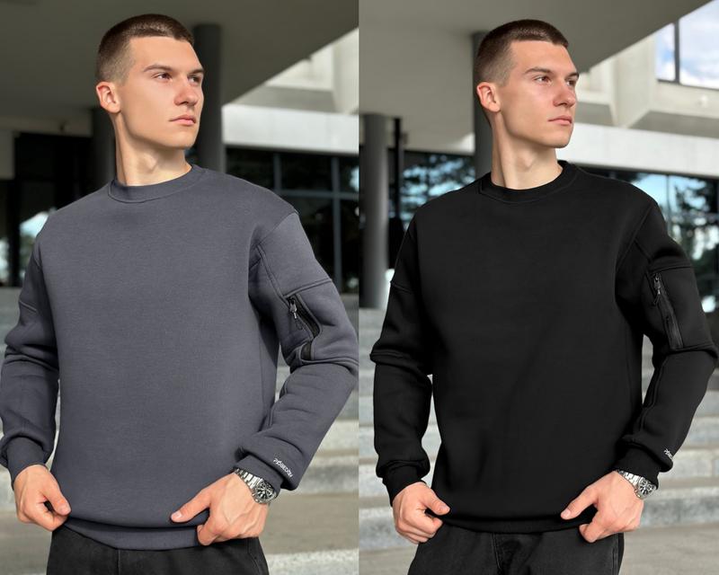 Свитшот Pobedov Apex - Цвет: черный, темно-серый🆕 Материал: трехнитка с начесом (состав ткани 80% cotton, 15% polyester, 5% elastan) Стиль: повседневный. Свободный крой, приспущенный рукав. Манжет рукава, манжет низа изделия и горловина выполнены из трикотажной резинки. На левом рукаве - функциональный карман на молнии. На левом рукаве фирменная рефлективная наклейка Pobedov. Сезон: осень/зима.