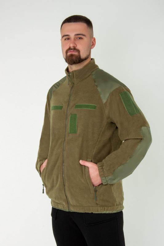 Размеры 48-58 Полотно Флис однотонный Теплая кофта для мужчин, выполненная из полотна "Флис". Флис - это неприхотливая ткань, которая отлично сохраняет тепло даже во влажном виде. Модель с воротником, на застежке "Молния", имеет боковые карманы, липучки для шевронов и вставки из плащевки. Карманы застегиваются, рукава и низ кофты присборены на резинку, которая выполняет функцию "Манжет", такие манжеты способствуют сохранению тепла под одеждой, а также защищают от ветра и задирания.