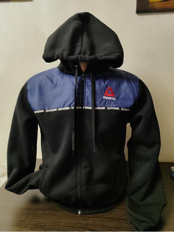 Мужская толстовка утепленная Reebok.Размер 48.Производитель Китай.Цвет черный, вставки из плащевки. Замеры 48 р:плечи 45 см,рукав 63 см, Полуобхват груди 48 см, длина изделия 65 см.