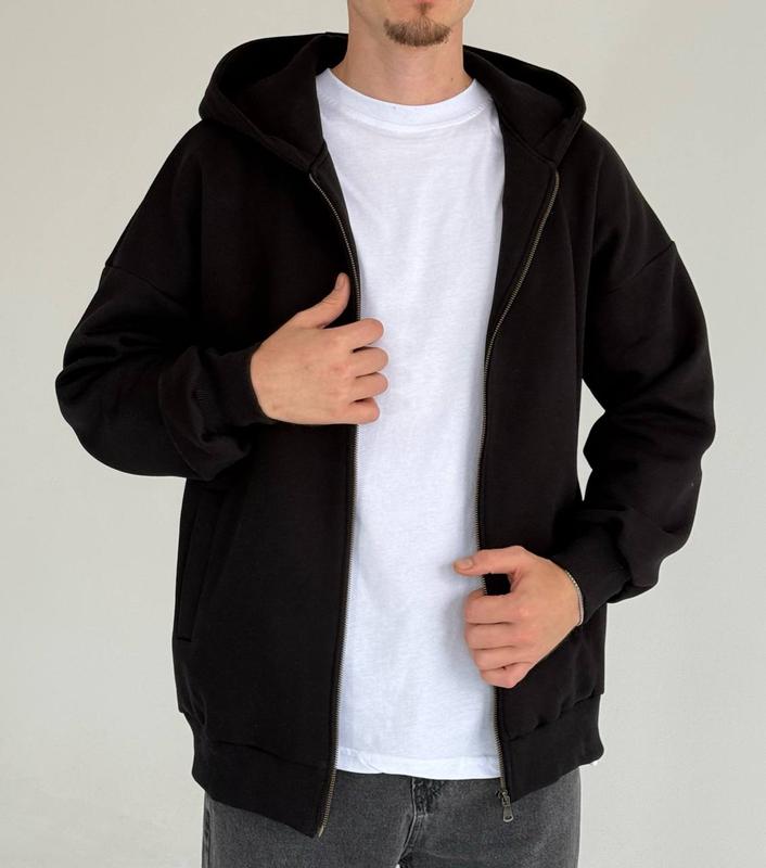 Толстовка зепкая мужская черная с капюшоном оверсайз осенняя весенняя зимняя теплая на фли...